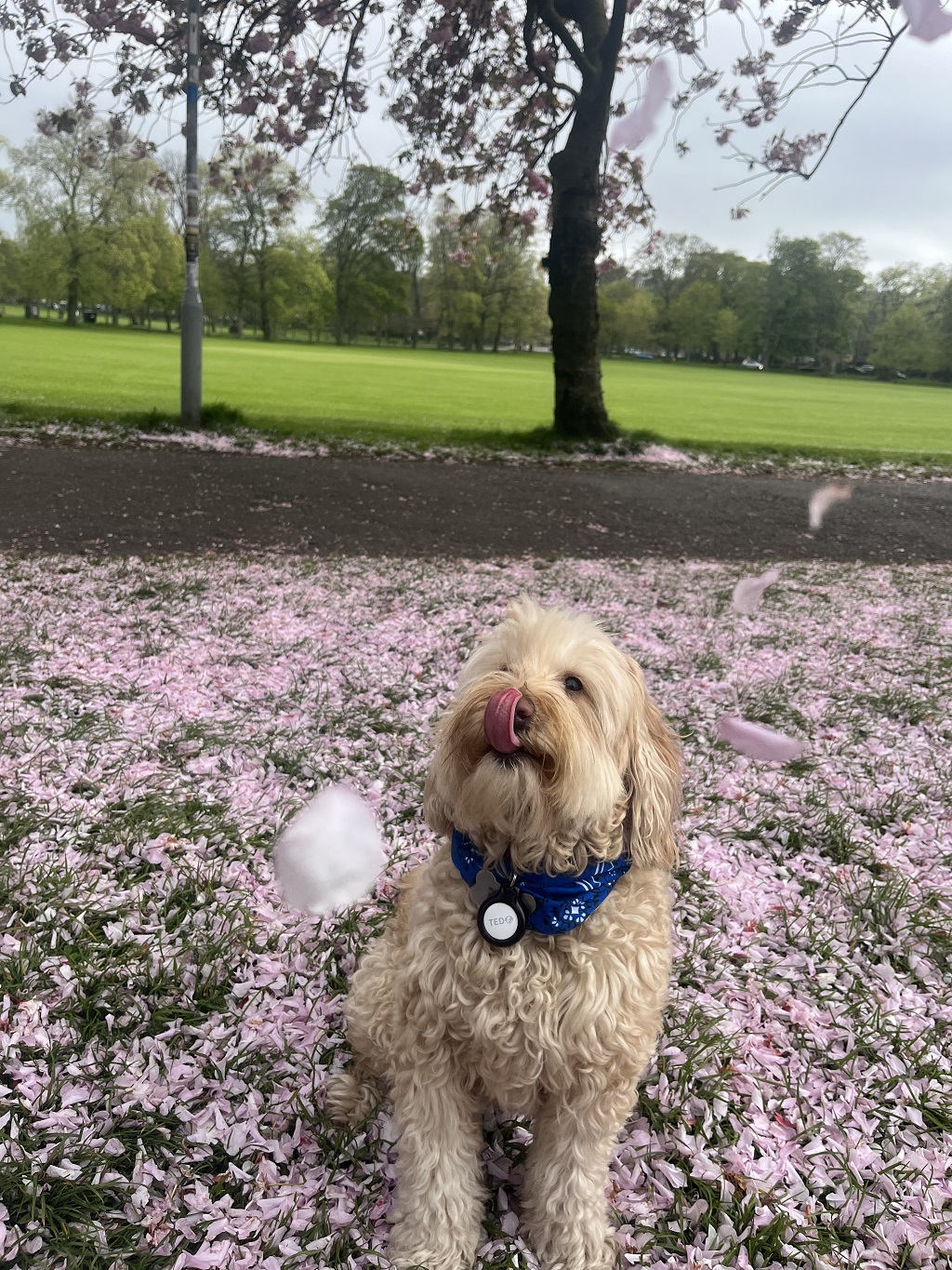 Leah, from team Wee Walkers at Transform Scotland, sent in a photo of her dog enjoying a walk amongst the cherry blossom.